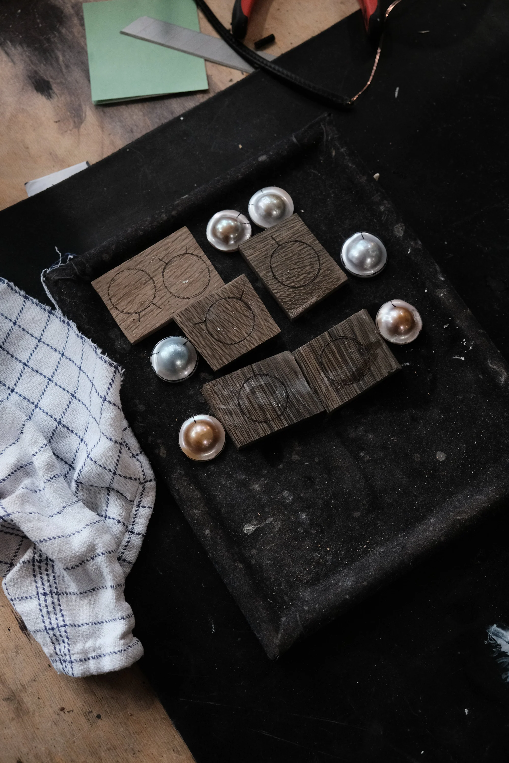 Button earrings with mabé pearls set in bog oak, finished with silver-plated brass ear clips. Lightweigth for every day wear. The pearls vary naturally in size, resulting in subtle differences within each pair.